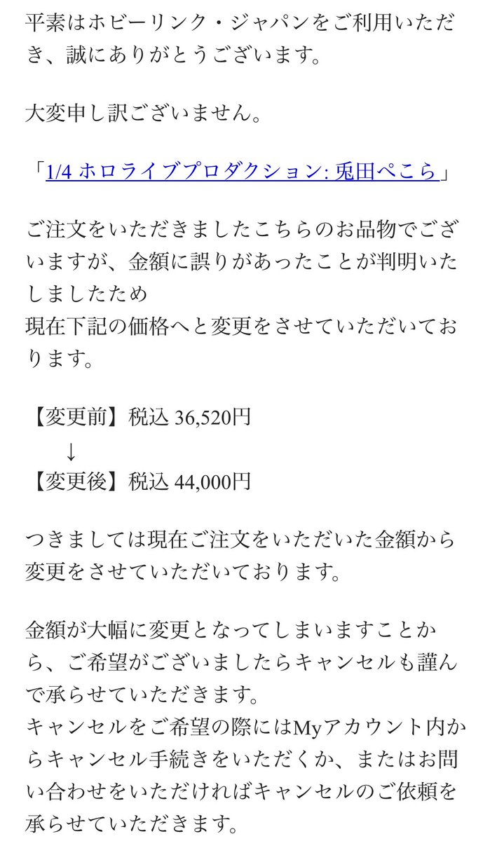 【悲報】「兎田ぺこら」最安だったホビーリンクが金額を変更!34,694円→44,000円いきなり定価販売「不満ならキャンセルは受け付ける」に「しなくていいから最初の値段で売れ」の声 : ホビログ ホビー系まとめサイト