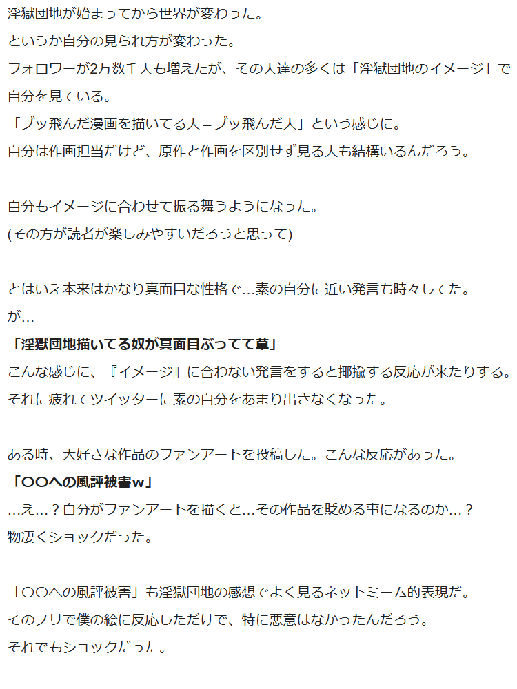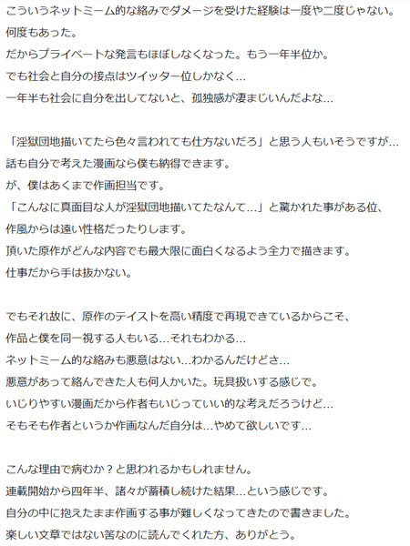 読者が気軽に作品を楽しめなくなりそうな事は極力書かないようにしてきた。でも感情に蓋し続けてると心も擦り減っていく。ずっと作品の為のツイッターしてたけど今は自分の為に書いてます