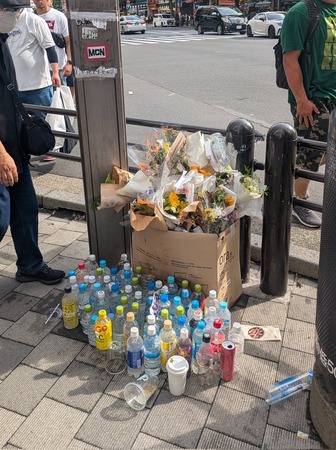 秋葉原・中央通り交差点。花や飲みものが供えられていた事件現場は完全にゴミ捨て場となってしまい、ひどい有様
