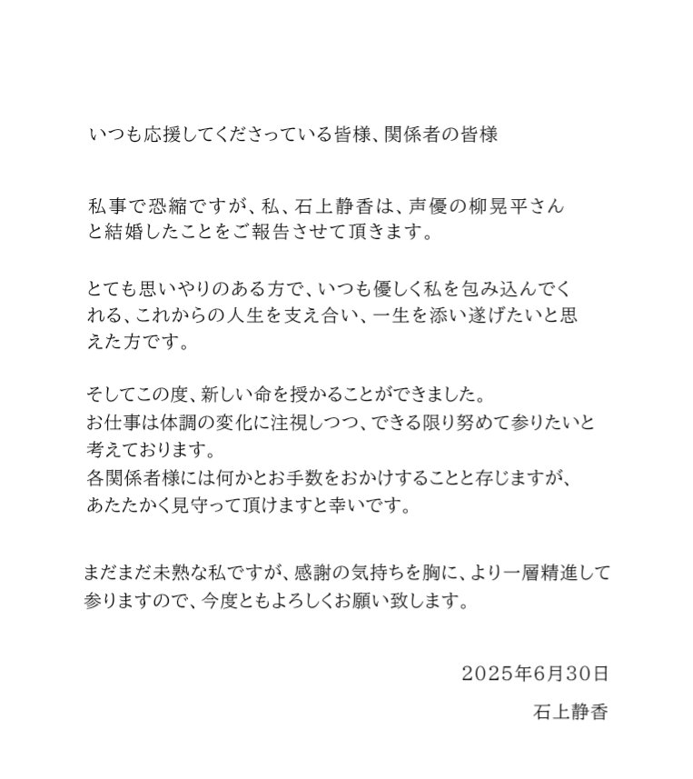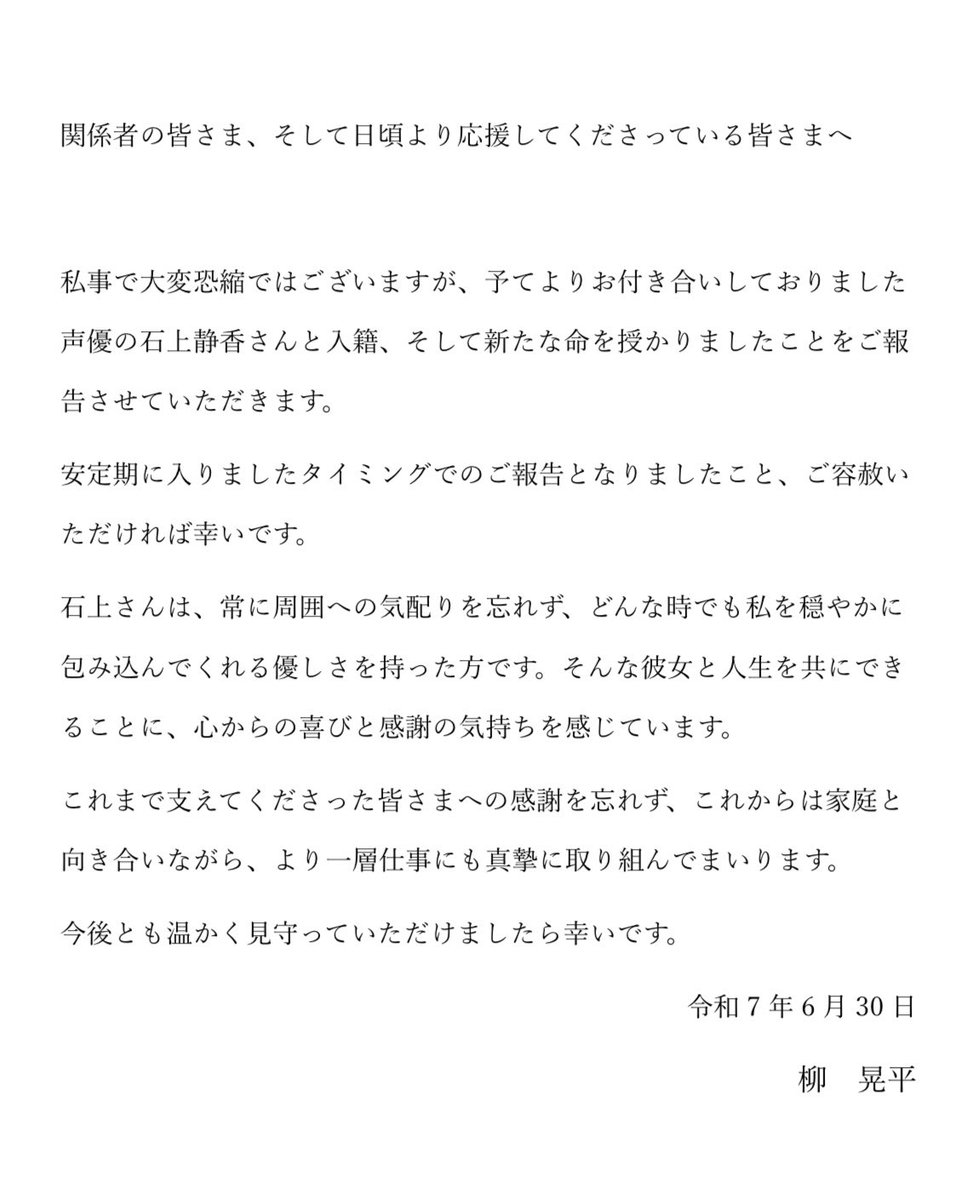 私事で大変恐縮ではございますが、予てよりお付き合いしておりました 声優の石上静香さんと入籍、そして新たな命を授かりましたことをご報 告させていただきます。