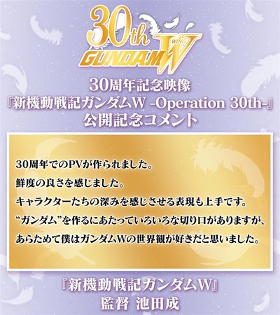 『新機動戦記ガンダムW -Operation 30th-』公開に際して、TVシリーズ『新機動戦記ガンダムW』 #池田成 監督よりコメントをいただきました。
